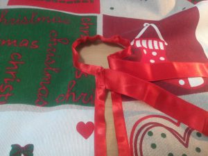 Vamos a rematar todo el trabajo con un vies de cinta de raso. Yo en mi caso como tenia un monton de cinta roja de unas cosillas que hice hace tiempo, la he planchado doblada por la mitad y la he utilizado como un vies.
